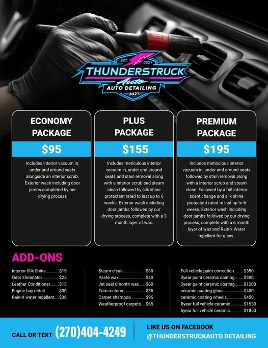 This package offers a step up from standard detailing with steam-powered interior cleaning and a protective exterior wax finish — ideal for maintaining your vehicle’s clean, polished look between full details. -